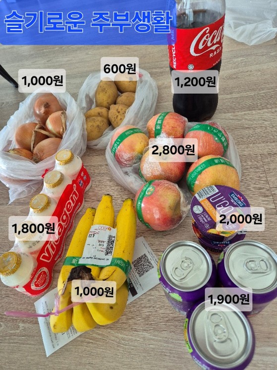 ○ 그 밖에 요쿠르트(5개 1800원), 바나나(한뭉치 2,000원), 사과(보통사이즈 6개 2,800원) , 콜라1.5L (1,200원) 가격도 적어봤습니다.