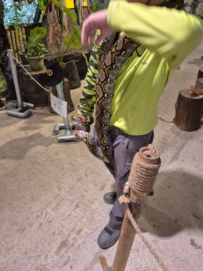 조금 더 긴장되는 구역은 파충류 체험존입니다. 입구에 들어서자마자 덩치 큰 이구아나가 가만히 앉아 있었는데, 고요하지만 존재감이 상당했습니다. 그 옆에는 구렁이가 직원의 몸을 감고 있었는데, 보는 것만으로도 등골이 서늘해지더군요. 가까이 다가가 사진은 찍었지만, 직접 만져보는 용기는 끝내 내지 못했습니다. 그래도 아이들은 “진짜 뱀 맞아?”라며 신기해했고, 직원이 안전하게 관리하는 모습 덕분에 안심할 수 있었습니다.