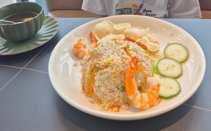 작은 녀석은 매번 볶음밥 만 먹습니다. 이번 해산물 볶음밥은 큰 새우3개, 오징어 조각, 오이, 과자(?)가 있습니다. 하얗게 보이는것이 과자(새우튀김과자 맛) 입니다.