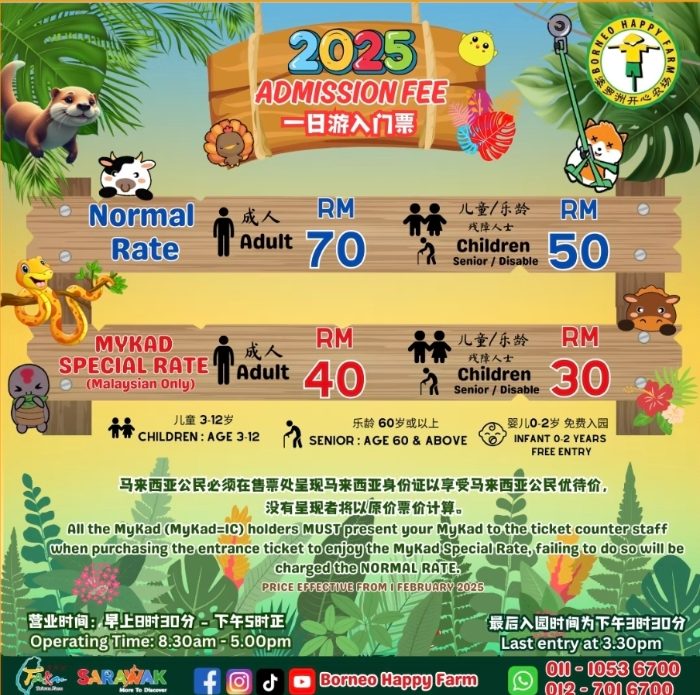 쿠칭에서 가족과 함께 가볼 만한 대표적인 체험형 농장, 쿠칭시내에서 40분 이내에 도착할 수 있는 보르네오 해피팜(Borneo Happy Farm). 벌써 네 번째 방문인데, 매번 비슷한 듯하면서도 새로운 즐거움이 있어 계속 찾게 되는 곳입니다. 이번에는 말레이시아의 공휴일이라 그런지 평소와는 분위기가 완전히 달랐습니다. 주차장부터 차들로 가득 차 있었고, 매표소 앞에도 가족 단위 방문객들이 길게 줄을 서서 티켓을 끊고 있었습니다. 평일에 왔을 때는 정말 사람이 없어서 “이러고도 운영이 될까?” 싶을 정도였는데, 오늘처럼 북적이는 모습을 보니 또 다른 활력과 재미가 느껴졌습니다.