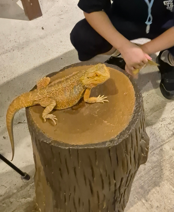 조금 더 긴장되는 구역은 파충류 체험존입니다. 입구에 들어서자마자 덩치 큰 이구아나가 가만히 앉아 있었는데, 고요하지만 존재감이 상당했습니다. 그 옆에는 구렁이가 직원의 몸을 감고 있었는데, 보는 것만으로도 등골이 서늘해지더군요. 가까이 다가가 사진은 찍었지만, 직접 만져보는 용기는 끝내 내지 못했습니다. 그래도 아이들은 “진짜 뱀 맞아?”라며 신기해했고, 직원이 안전하게 관리하는 모습 덕분에 안심할 수 있었습니다.
